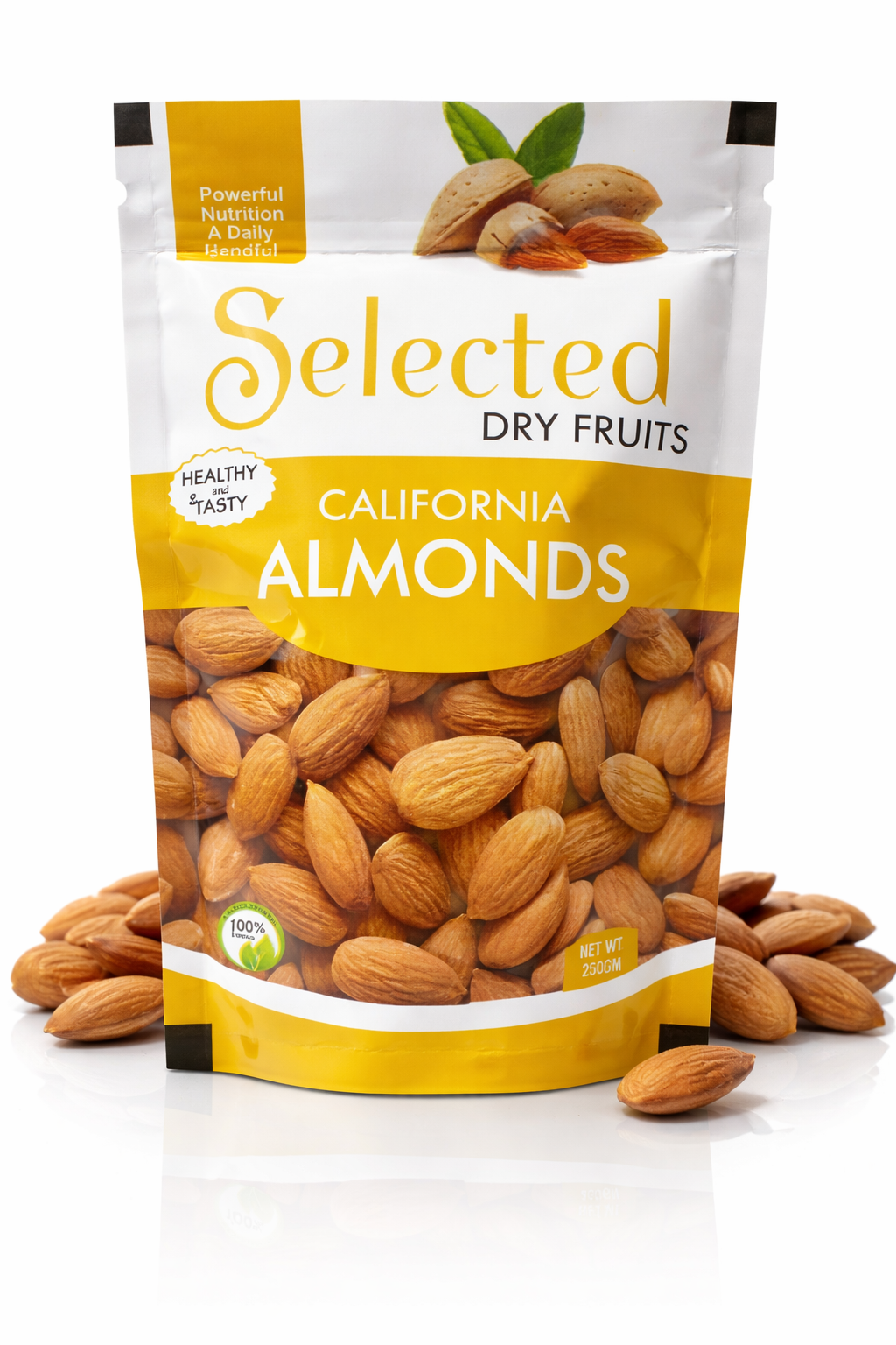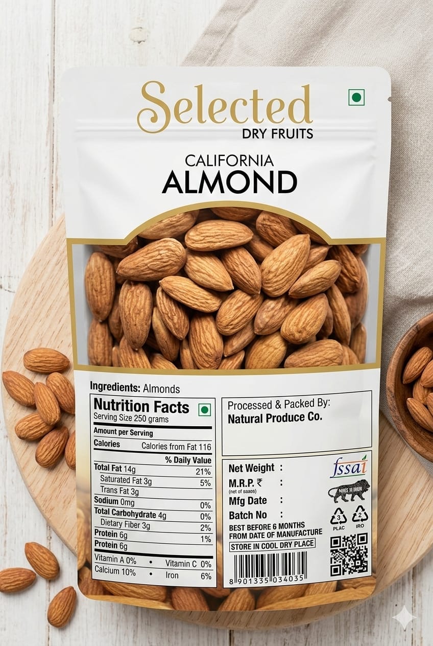 Selected Dry Fruits California Almonds 250g contains premium quality whole almonds carefully packed to keep them fresh and crunchy. These almonds are naturally rich in protein, fiber, and healthy fats, making them a smart choice for daily nutrition.